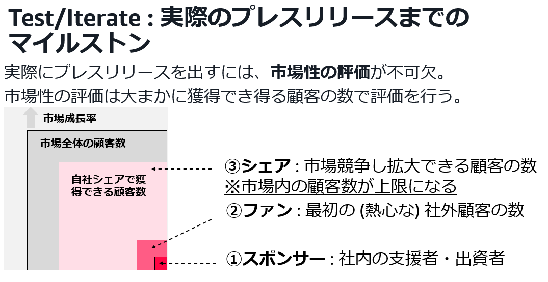 改善編では、今後に向けて実際のプレスリリースまでのマイルストンを立てます。実際のプレスリリースまでに何個のマイルストンがあるのかについても、スポンサー、ファン、シェアの獲得といった明確な段階を定義し達成すべき段階について解釈がぶれないよう構成しています。