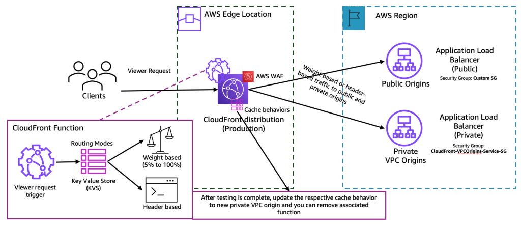 設定、ネットワーク、アプリケーションのパフォーマンスメトリクスを検証します。明らかな問題を解決した後、KVS を更新して重み付けでトラフィックをルーティング {"mode": "weighted", "weight_percentage": 5} します。まずトラフィックの 5% をプライベートオリジンに送信し、weight_percentage を徐々に 100% まで増加させます。プライベートオリジンがトラフィックを受信し、期待どおりに動作していることを確認したら、キャッシュビヘイビアを更新して、現在のパブリックオリジンの代わりにプライベートオリジンを使用するように変更します。その後、トラフィックがプライベート VPC オリジンにルーティングされていることを検証します。エラーがないことを確認したら、キャッシュビヘイビアから CloudFront Function を削除します。他のキャッシュビヘイビアについても同じプロセスを繰り返します。