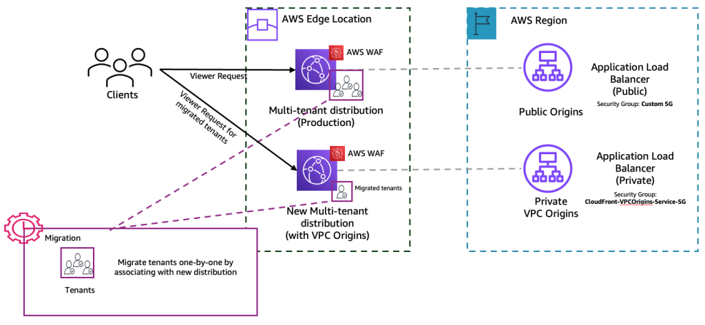 推奨されるアプローチは、VPC オリジンを使用した新しいマルチテナントディストリビューションを作成し、各テナントを新しいディストリビューションに関連付けることです。これにより、各テナントを個別にテストし、テナントを 1 つずつ VPC オリジンを使用した新しいディストリビューションに移行できます。