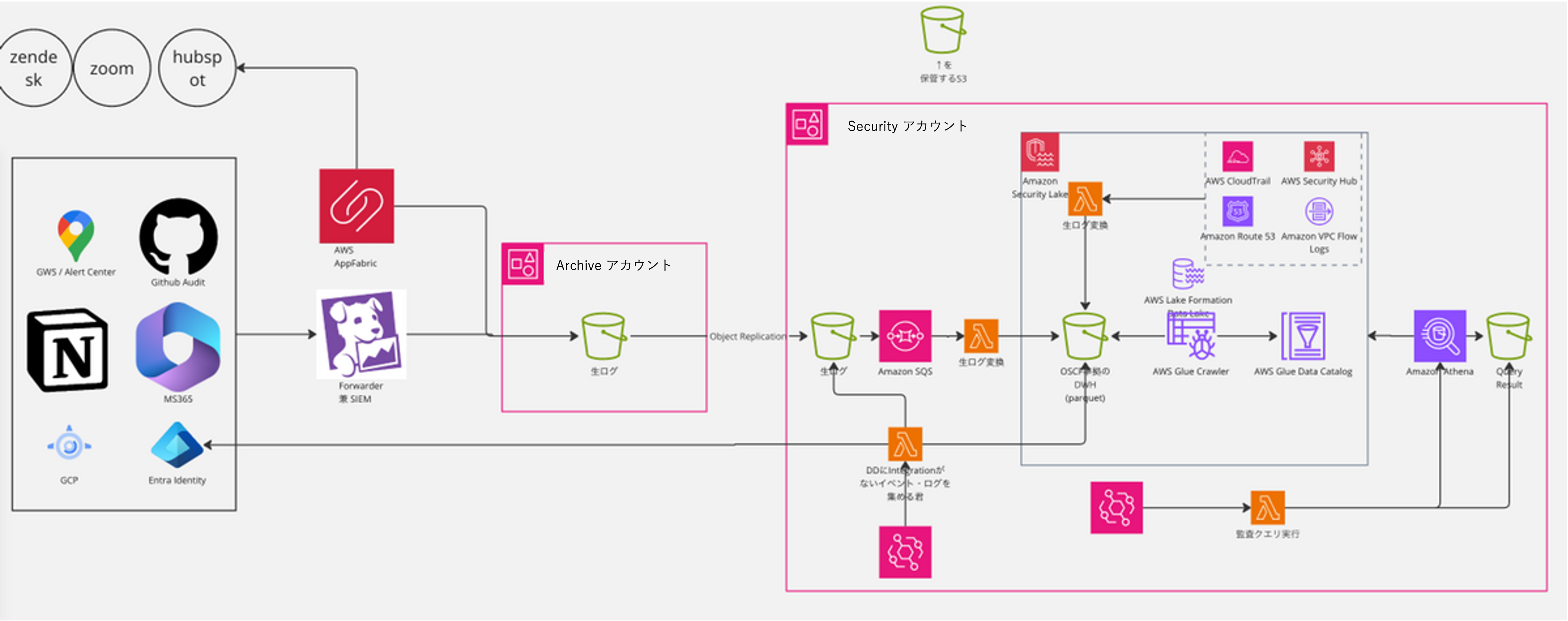 鈴木様: Amazon Security Lake を中心とした構成は下図の通りです。複数のソースシステムからログを取り込み、Archive 専用の S3 に保存後、Object Replication により分析アカウントにレプリケートしています。続いて Lambda がデータを OCSF(Open CyberSecurity Schema Framework)に変換し、Security Lake に投入します。そして、Lambda が日次でセキュリティ監査用のジョブを実行する仕組みになっています。