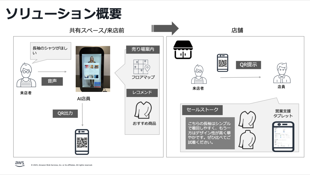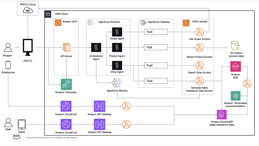 小売業界では、顧客の購買行動が多様化し、実店舗にもオンラインのようなパーソナライズ体験が求められるようになっています。顧客は自分に最適な提案を受け、迷うことなくスムーズに買い物できる体験を期待するようになりました。こうした背景のもと、AWS は Amazon Bedrock AgentCore を活用し、PROTO 社のサイネージデバイスと連携したマルチ AI エージェントによる新しい販売支援アプローチを提案しています。本記事では、その全体構成と技術の仕組み、そして店頭に導入された際の顧客側・店舗側それぞれの活用方法について紹介します。