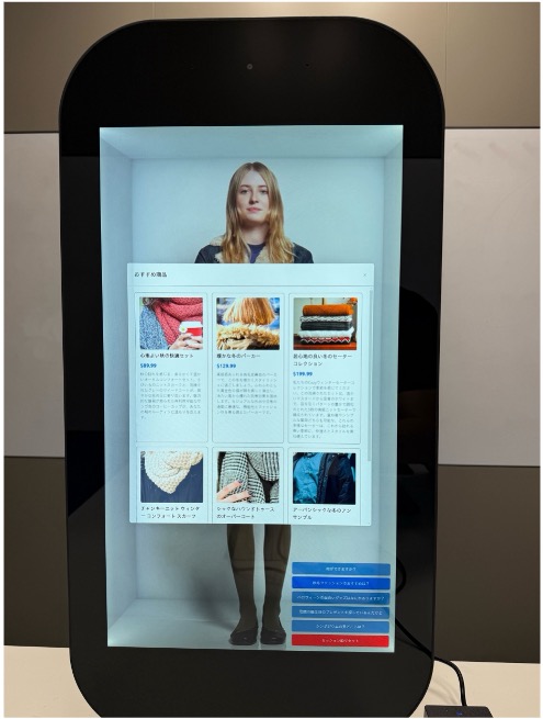 店頭では、アバターが自然な対話を通じて商品やフロアを案内します。案内には、Amazon Transcribe を活用して多言語対応にしています。また、必要に応じて商品比較のポイントやおすすめの組み合わせを Amazon Personalize を用いて提示します。例えば「シンプルなデザインの長袖と華やかなデザインのものを比べて試してみてください」といった会話が自動生成され、顧客の好みに合わせて提案されます。また、多言語理解と音声出力を組み合わせることで、海外からの来店者にも対応可能です。これらの対話内容は AgentCore Memory に蓄積され、顧客体験の改善に役立てられます。