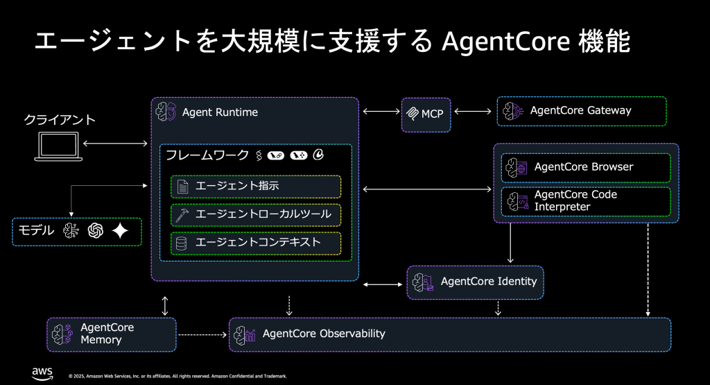 AgentCore Runtime は、AWSのサーバーレス基盤上で動作するエージェント専用の実行環境です。任意の AI フレームワークで構築したエージェントを「Bedrock AgentCore App」としてコンテナ化し、Amazon ECS または Lambda 経由でスケーラブルに稼働させます。長時間のタスク(最大8時間)や非同期実行をネイティブにサポートしており、たとえば店舗内のアバター案内のような持続的インタラクションにも適しています。また、Runtime はマルチエージェント間の通信チャネルを MCP(Model Communication Protocol)で統一しているため、異なる言語モデルやバックエンドでも相互協調が可能です。