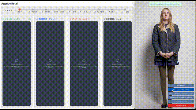 このソリューションの特徴は、複数の AI エージェントがそれぞれの役割を担い、連携して一貫した顧客体験を実現する点にあります。顧客とのコミュニケーションを担う「アバターエージェント」、商品情報を扱う「商品情報エージェント」、店舗運営を支援する「店舗支援エージェント」、そして全体を統制する「オーケストレーターエージェント」が協調して動作します。