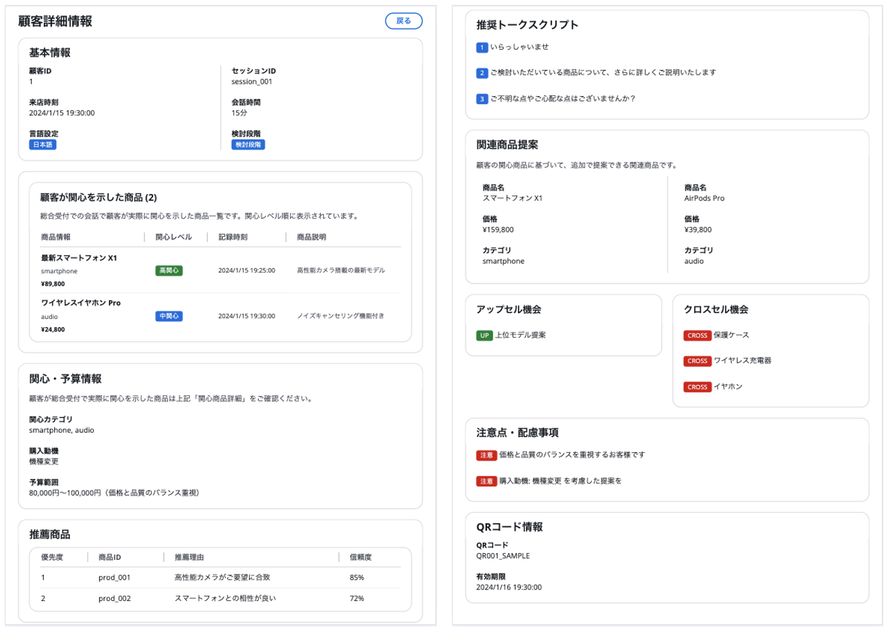 さらに、顧客がどの商品に興味を示したか、どのような会話がされたかといった情報が掲示され、購買心理に基づく販売支援が可能になります。店舗は AI を通じて常にナレッジを蓄積し、接客の品質を可視化・標準化することができます。AI による支援で人員不足の課題も解消され、スタッフはより創造的な顧客サービスに注力できるようになります。