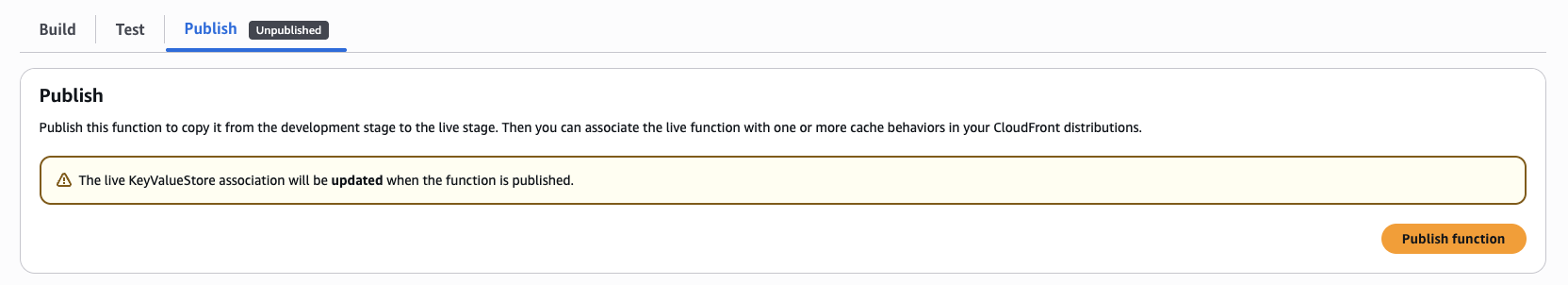 4. [Publish] タブを選択し、以下に示すように [Publish function] をクリックして関数を公開します。
