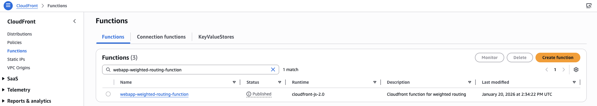 5. 関数が公開されたことを確認します。以下に示すように、ステータスは “Development” から “Published” に変更されます。