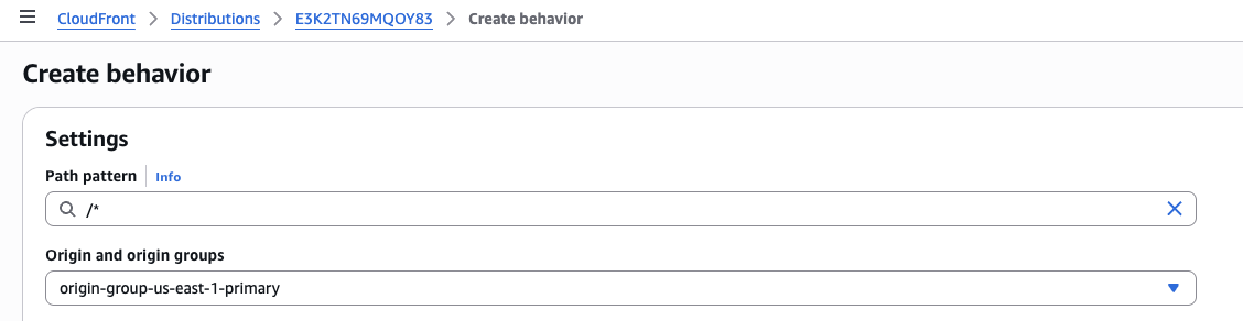 6. Amazon CloudFront コンソールを開き、[Distributions] を選択してから、該当するディストリビューションを選択します。次に [Behaviors] タブを選択し、[Create Behavior] をクリックします。以下に示すように、Path pattern の入力と Origin and origin groups にデフォルト用のオリジングループを指定します。