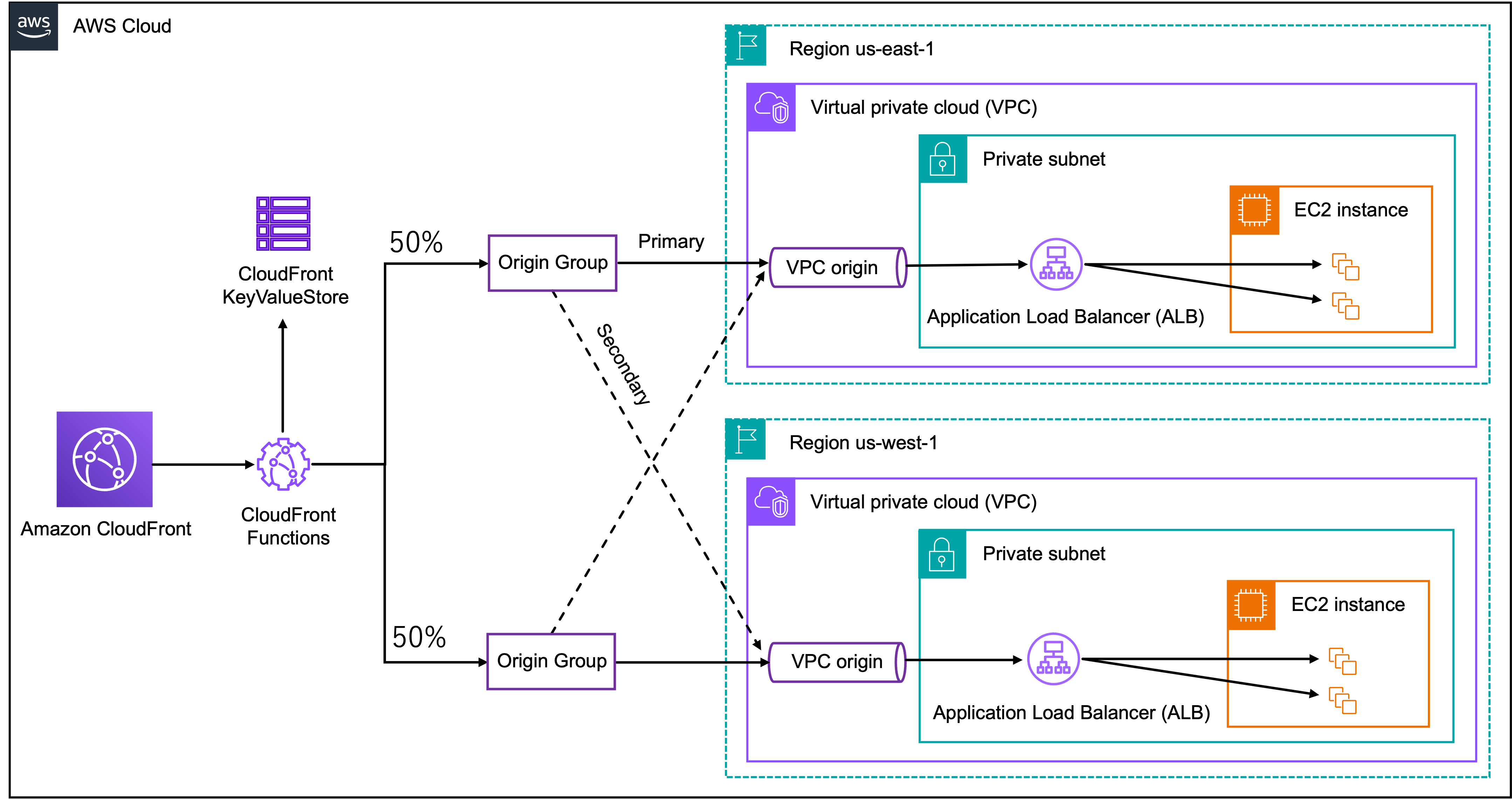 マルチリージョンのアクティブ/アクティブ構成を実装することで、複数の AWS リージョン(例:us-east-1 と us-west-1)でワークロードを同時に実行し、各リージョンがアクティブにトラフィックを処理します。CloudFront VPC オリジンは、CloudFront Functions を通じて加重ルーティングを実装することが可能であり、各リージョンの重みは CloudFront KeyValueStore に保存できます。これにより、再デプロイなしでリージョン間のトラフィック分散を調整できます。例えば、リージョン間でトラフィックを 50/50 に分割し、運用ニーズに基づいてリアルタイムで調整することが可能です。この構成により、単一リージョンに障害が発生した場合でも他のリージョンでサービスを継続できるため、アプリケーションの可用性が向上します。また、トラフィックの重み付け調整により、計画的なメンテナンスやパフォーマンス最適化時にも柔軟に対応できます。