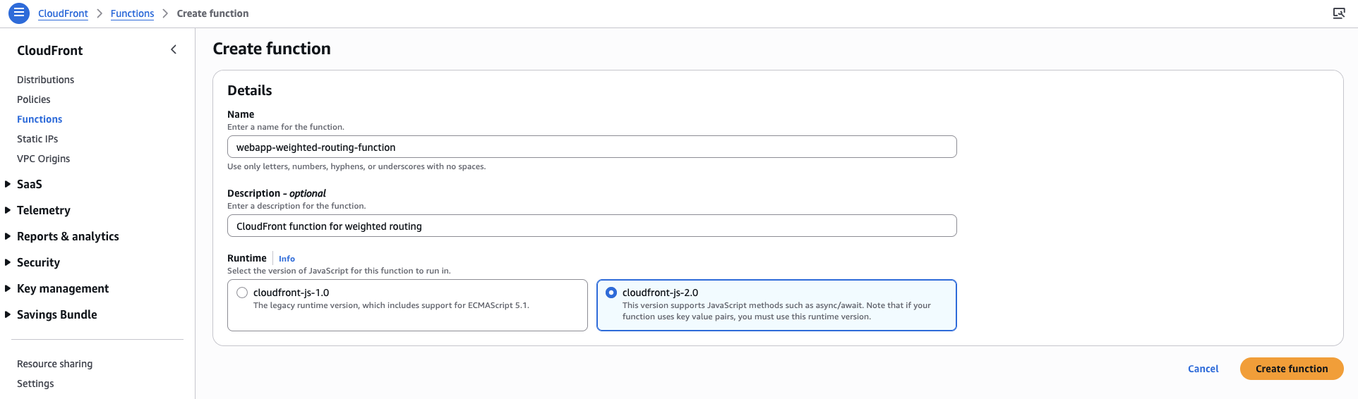 1. Amazon CloudFront コンソールを開き、[Functions] を選択します。[Create function] から以下に示すように、関数名を入力して JavaScript バージョンを指定した後、[Create function] をクリックして関数を作成します。