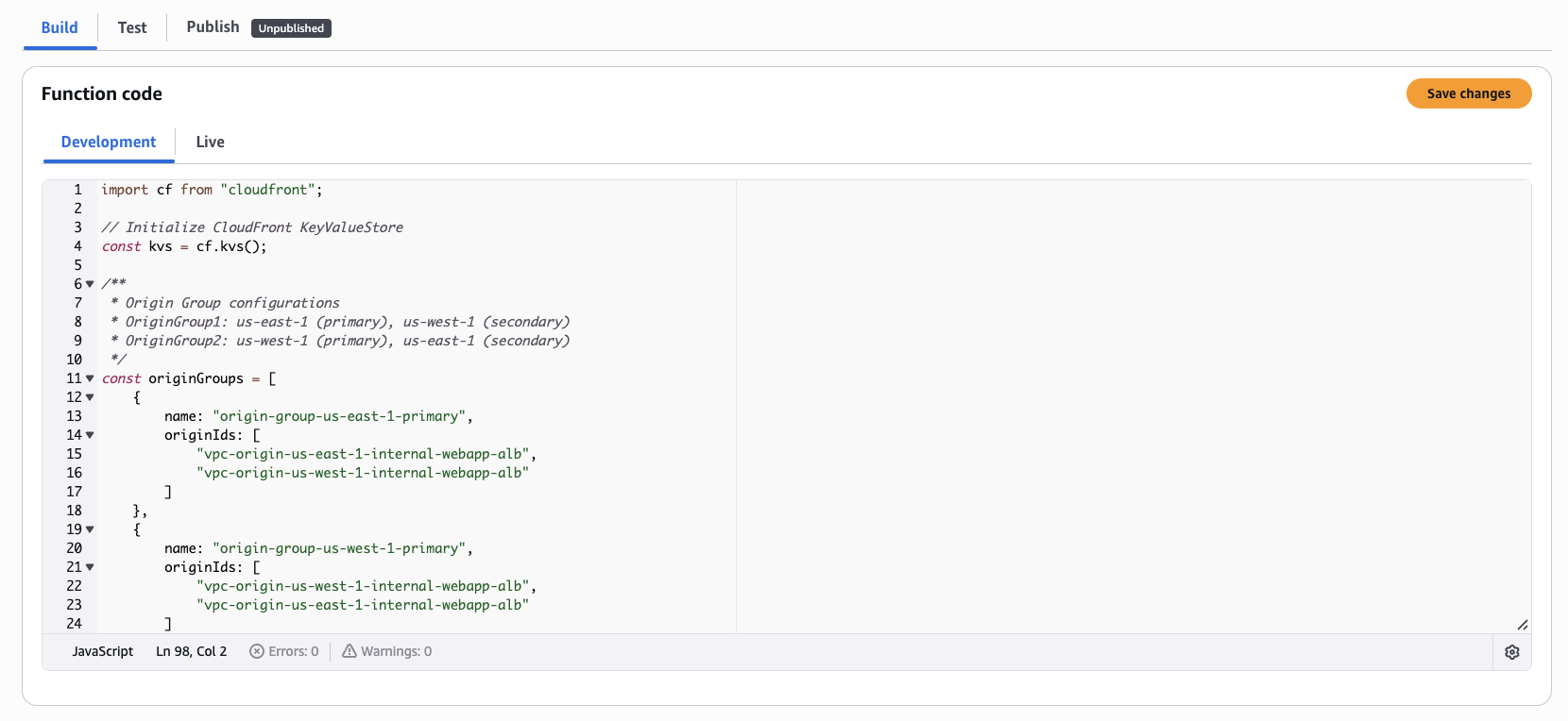 3. [Development] ウィンドウ内の [Build] タブで重み付けルーティングのロジックを実装し、以下に示すように [Save changes] をクリックします。