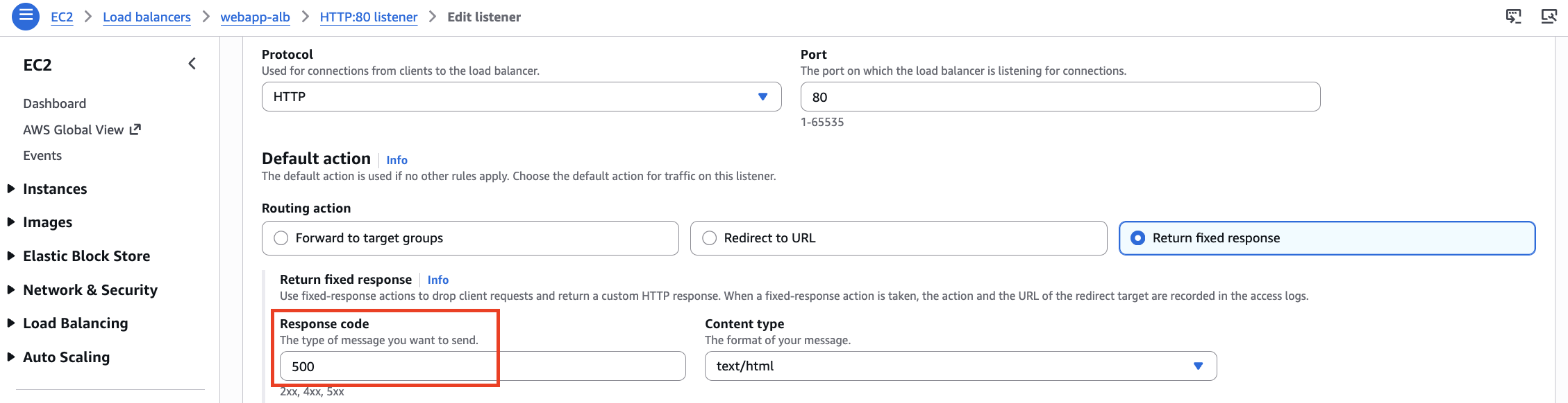5. Amazon EC2 コンソールを開き、VPC オリジンとして設定されている us-west-1 の ALB リスナー Default action として [Returned fixed response] を選択し、Response code を 500 エラーに設定