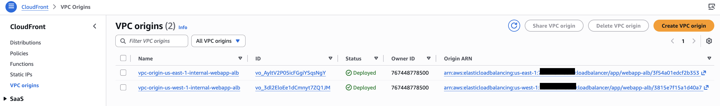 2. 両リージョンの VPC オリジンが作成されたことを確認してください。新しい VPC オリジンのステータスは最初 “Deploying” となり、以下に示すように、使用可能な状態になると “Deployed” に変わります。