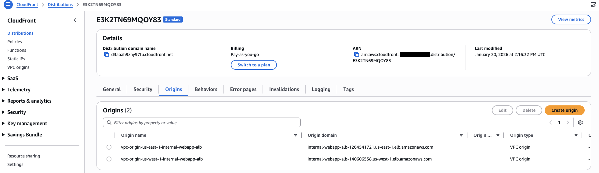 4. 以下に示すように、両方の VPC オリジンがディストリビューションに追加されたことを確認します。