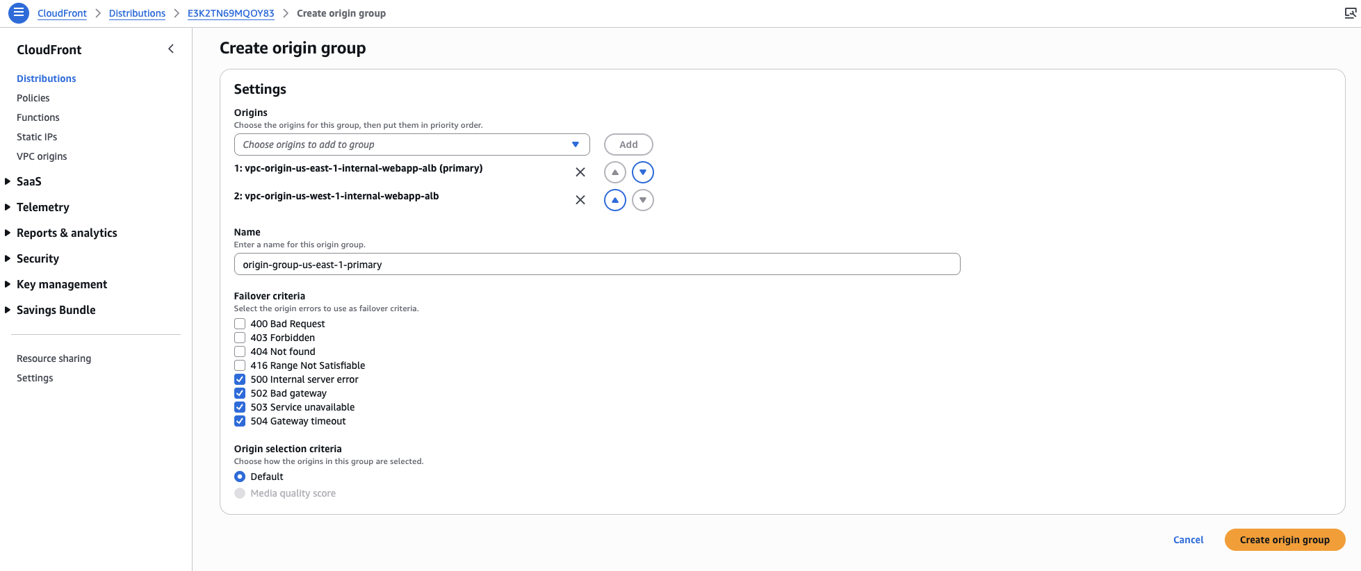 5. Amazon CloudFront コンソールを開き、[Distributions] を選択してから、該当するディストリビューションを選択します。次に [Origins] タブを選択し、[Create origin group] をクリックします。以下に示すように、Origins のプライマリとセカンダリの VPC オリジンに加え、 Failover criteria を指定し、デフォルト用のオリジングループを作成します。