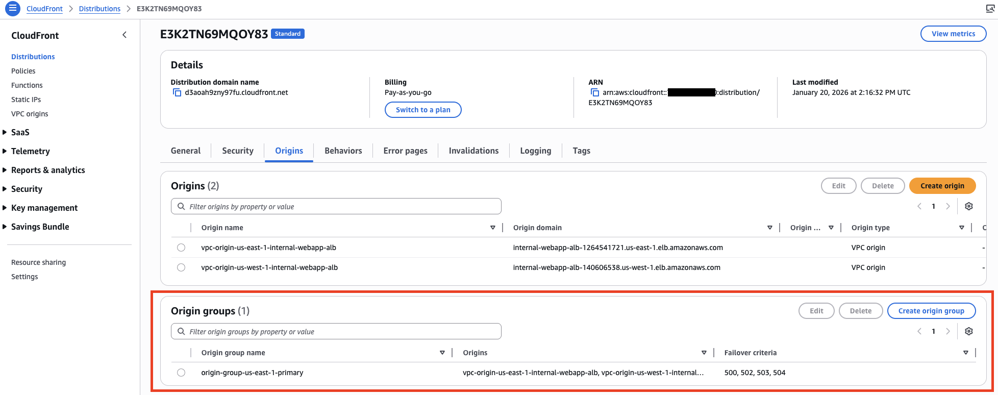 * OriginGroup1: us-east-1 (primary), us-west-1 (secondary)