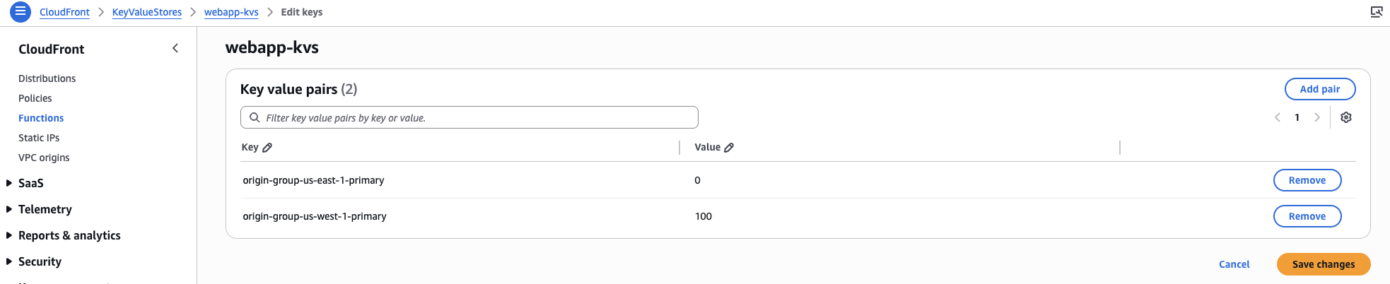 3. Amazon CloudFront コンソールを開き、[Functions] と [KeyValueStores] タブを選択します。KeyValueStore を選択し、[Key value pairs] セクションで [Edit] をクリックします。以下に示すように、VPC オリジンの重み値を変更し、[Save changes] をクリックします。