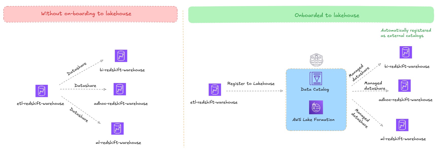 レイクハウスアーキテクチャはこの課題に対応し、既存の Amazon Redshift ウェアハウスをフェデレーテッドカタログとして公開できます。フェデレーテッドカタログは、同一アカウントとリージョン内の他のコンシューマー Amazon Redshift ウェアハウスに外部データベースとして自動的にマウントされ、利用可能になります。データの単一コピーを維持しながら複数のデータウェアハウスからクエリでき、複数のデータ共有の作成と管理が不要になり、ワークロード分離でスケールできます。権限管理は Lake Formation を通じて一元化され、マルチウェアハウス環境全体のガバナンスが効率化されます。
