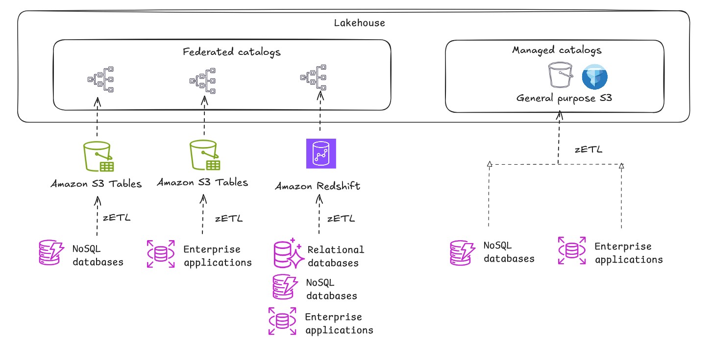 既存の Amazon Redshift ウェアハウス、セルフマネージド Iceberg を使用した汎用 S3、S3 Tables にレプリケートできるその他のサポートされるデータソースについては「Zero-ETL integrations」を参照してください。