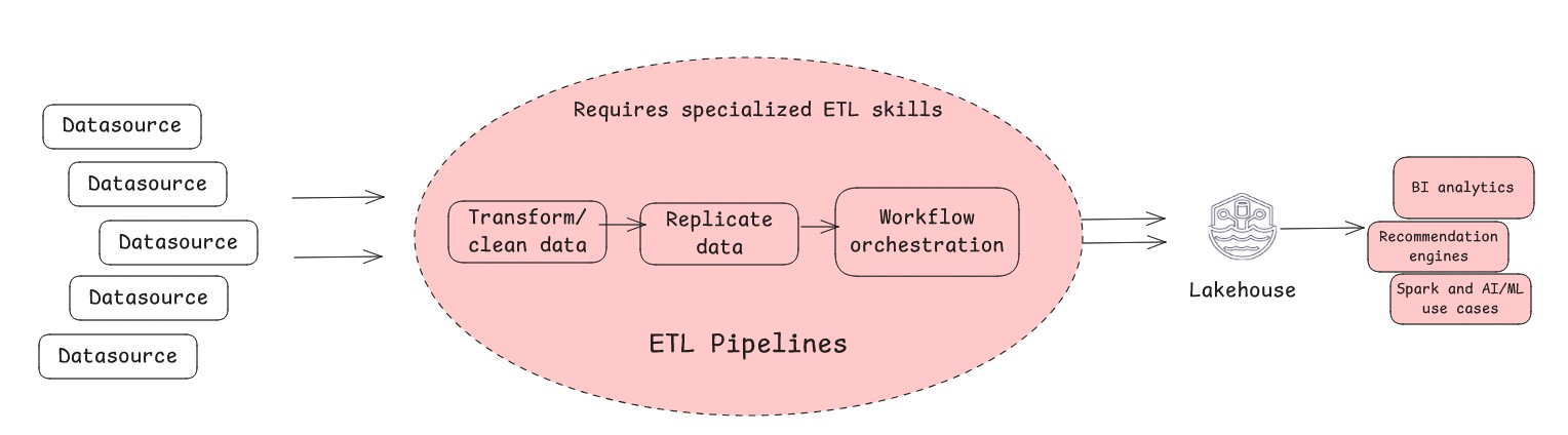 - 従来の ETL は、データを抽出し、変換してレイクハウスにロードする従来の方法です。
