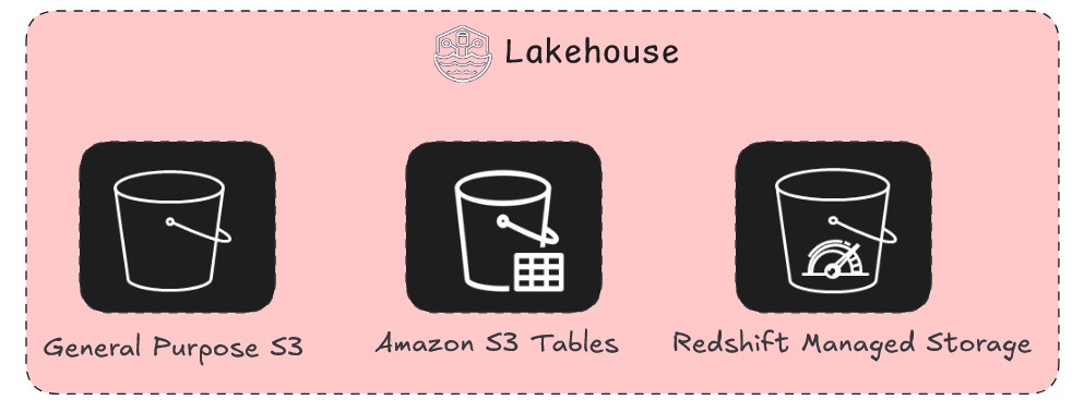 レイクハウスにデータを取り込む様々な方法を確認したところで、次の問題はデータの保存先です。以下の図のように、AWS ではデータレイク (Amazon S3 または Amazon S3 Tables) またはデータウェアハウス (Redshift Managed Storage) にデータを保存してモダンなオープンレイクハウスを構築でき、ワークロード要件に基づいて柔軟性とパフォーマンスの両方を最適化できます。