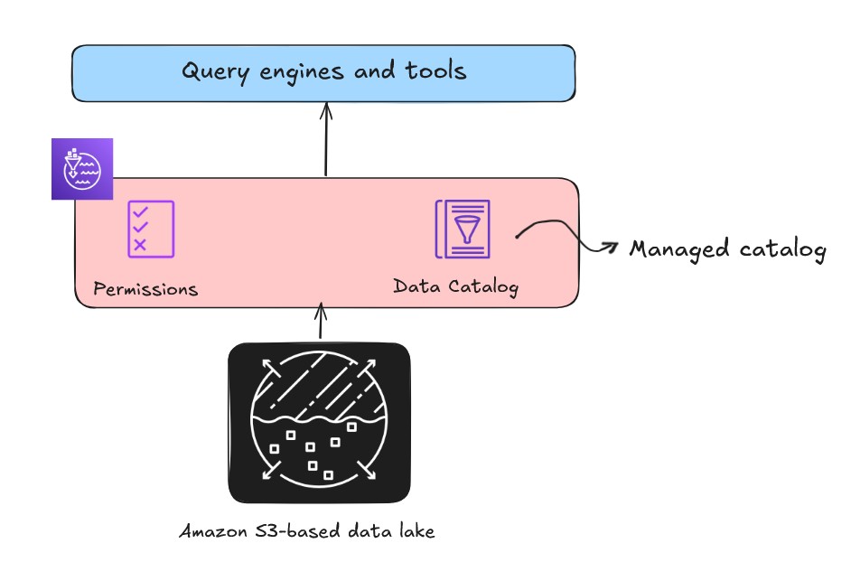AWS Glue クローラーを使用して、Data Catalog にメタデータを自動的に検出・登録できます。Data Catalog はデータ資産のスキーマとテーブルメタデータを保存し、ファイルを論理テーブルに変換します。データがカタログ化されたら、次の課題はアクセス制御です。フォルダごとに複雑な S3 バケットポリシーを使用することもできますが、管理とスケーリングが困難です。Lake Formation は Data Catalog 上にデータベーススタイルの一元的な権限モデルを提供し、個々のユーザーやロールに対して行、列、セルレベルのきめ細かなアクセスを付与または取り消す柔軟性を備えています。