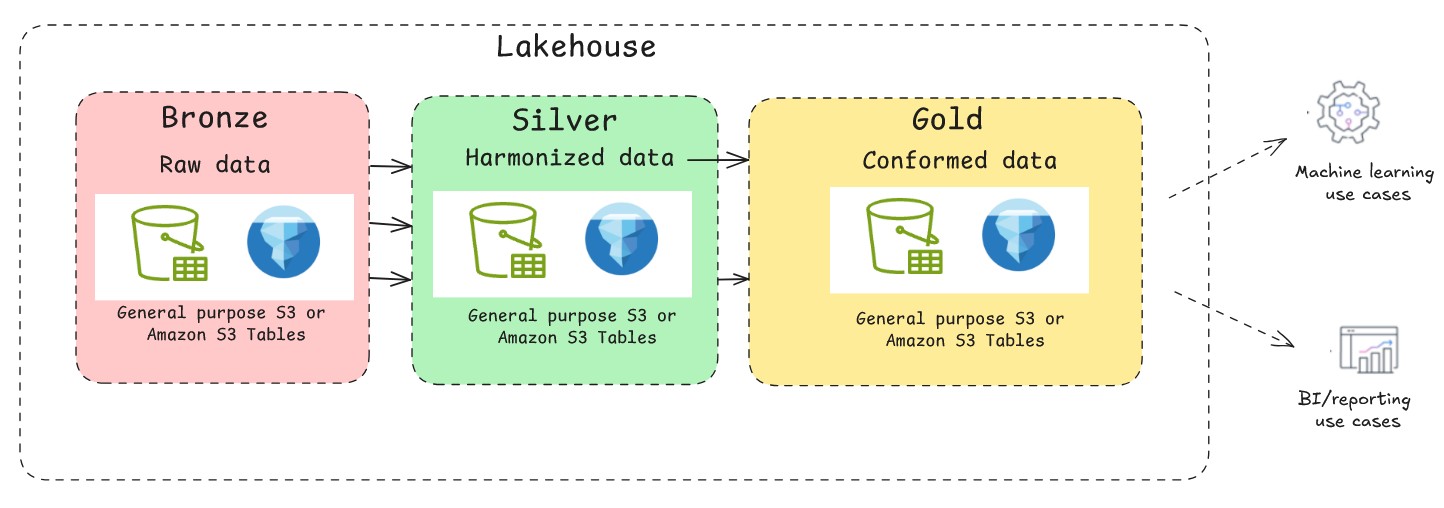 汎用 S3 上の基本的なデータレイクは、追記専用ワークロードに非常に効率的です。ただし、ファイルベースの性質上、従来のデータベースのトランザクション保証が欠けています。Apache Hudi、Delta Lake、Apache Iceberg などのオープンソースのトランザクショナルテーブルフォーマットを活用すると、この課題を解決できます。テーブルフォーマットによりマルチバージョン同時実行制御(MVCC)を実装でき、複数のリーダーとライターが競合なく同時に操作できます。スナップショット分離を提供するため、書き込み操作中でもリーダーはデータの一貫したビューを参照できます。以下の図は Apache Iceberg を使用した典型的なメダリオンアーキテクチャパターンを示しています。AWS で Apache Iceberg を使用してレイクハウスを構築する場合、Amazon S3 上のデータ保存には、セルフマネージド Iceberg を使用した汎用 S3 バケットと、フルマネージドの S3 Tables の 2 つの主要なアプローチから選択できます。それぞれに明確な利点があり、制御、パフォーマンス、運用負荷に対する具体的なニーズによって適切な選択が異なります。