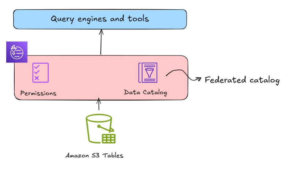 S3 Tables は、分析ワークロードに最適化された S3 ストレージを提供し、大規模な表形式データを保存するための Apache Iceberg 互換性を備えています。S3 テーブルバケットとテーブルを Data Catalog と統合し、Lake Formation コンソールまたはサービス API で Lake Formation データロケーションとしてカタログを登録できます (以下の図の)。このカタログはフェデレーテッドレイクハウスカタログとして登録・マウントされます。