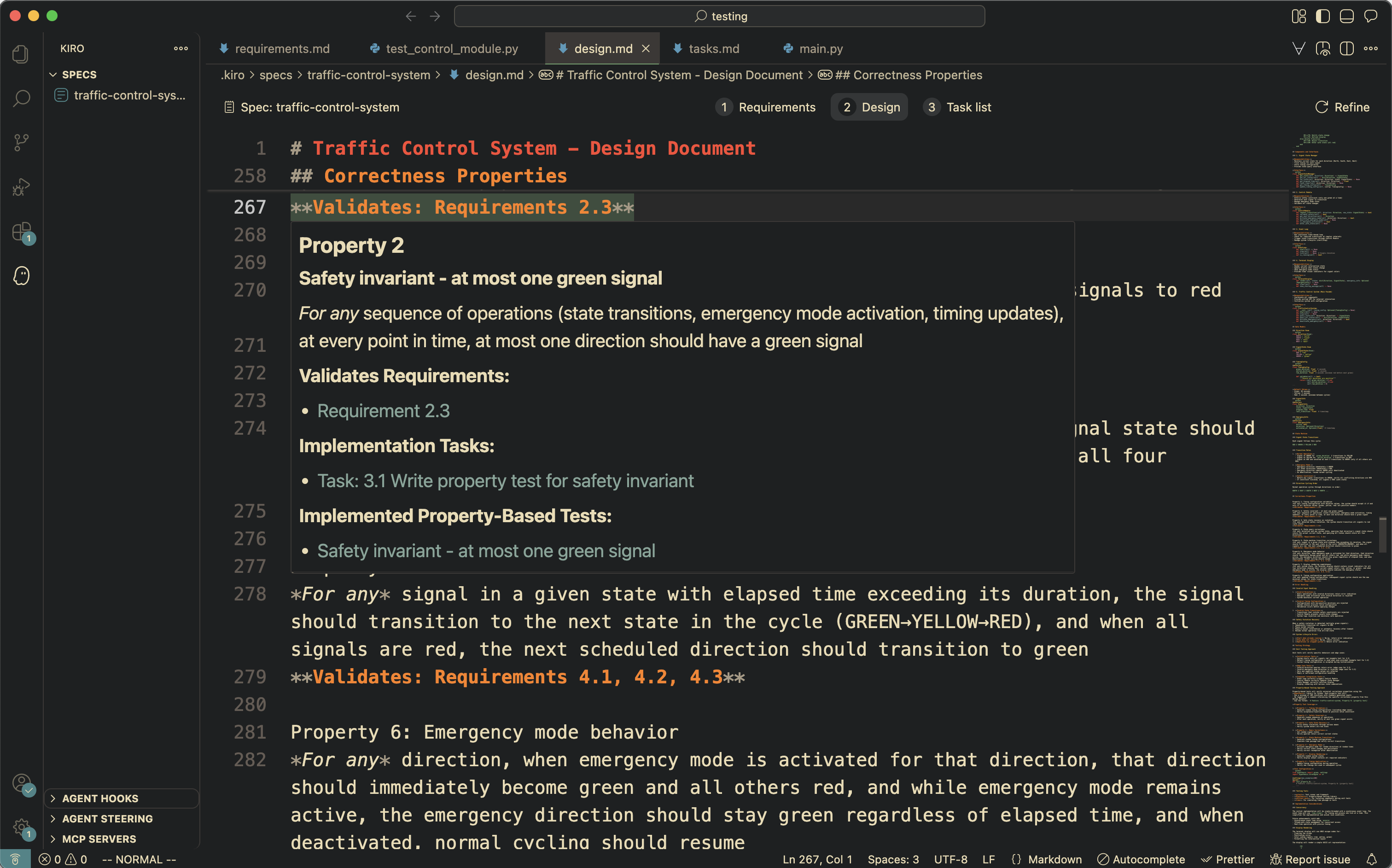 プロパティベーステストは 20 年以上前に Haskell プログラミング言語向けに QuickCheck というフレームワークで発明されました。それ以来、成長し成熟してきました。プロパティテストは、Kiro が行うような仕様駆動開発と非常に相性が良いです。なぜなら、仕様要件は多くの場合、直接的にプロパティを表現しており、これらのプロパティはプロパティベーステストを使ってテストできるからです。ある意味で、プロパティは仕様の(一部の)別の表現です。プロパティベーステストを使えば、動かして確認できる仕様表現が手に入ります。プロパティベーステストで構成される実行可能な仕様は、テキストの要件と簡単に結びつけられるため、プロパティテストがパスする限り、コードが要件通りに動作しているという確信が得られます。