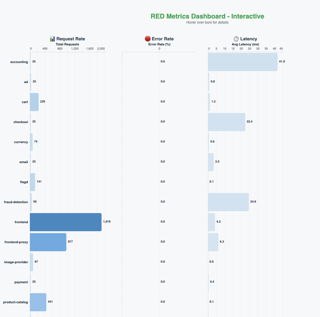 次の図のように、アプリケーション全体のリアルタイム RED (レート、エラー、期間) メトリクスダッシュボードを構築しました。