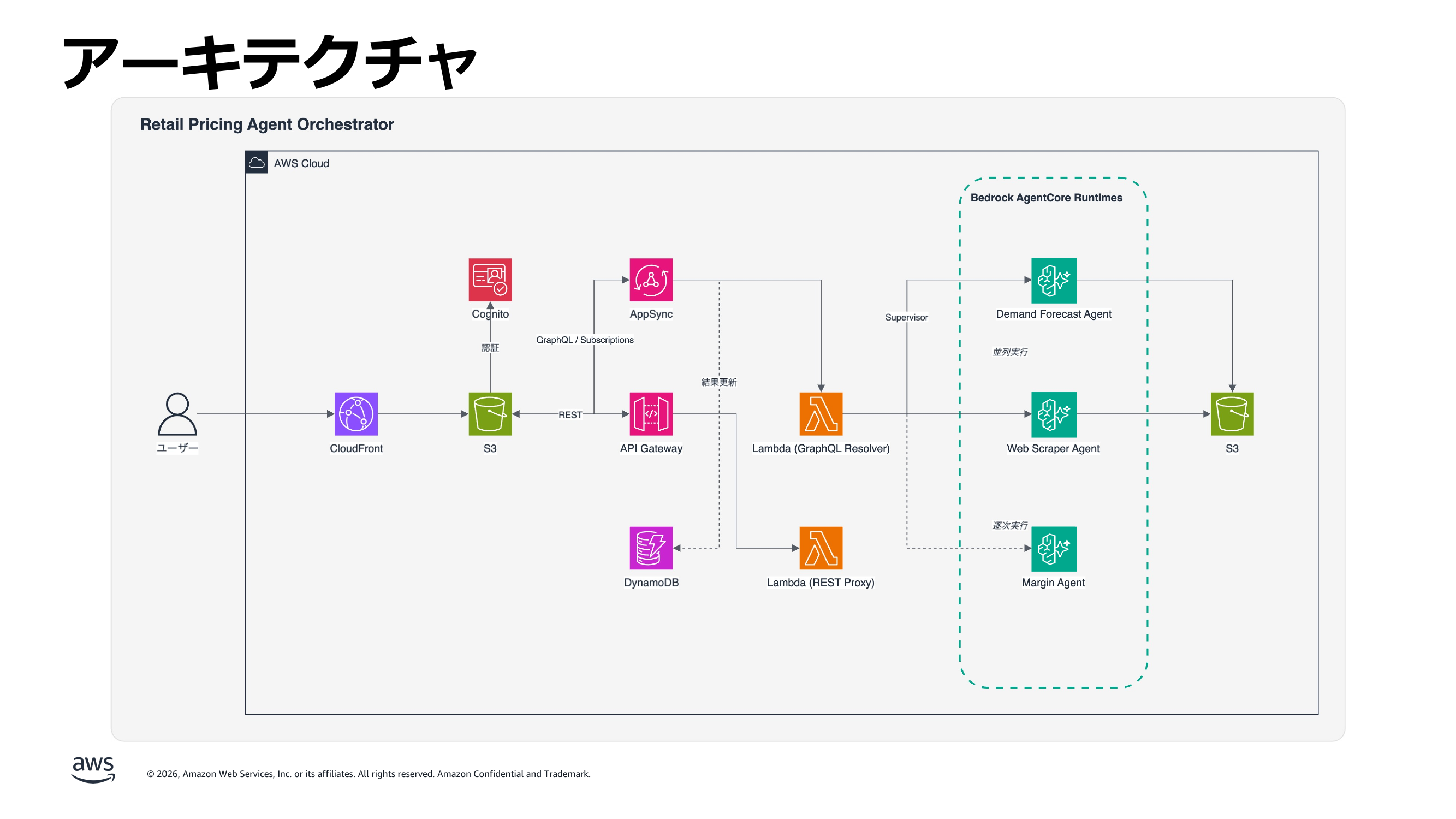 - Retail Pricing Agent:競合調査・需要分析・価格決定の3つのエージェントが連携し、生成 AI で価格戦略を自動化するデモをご紹介しました。(Retail Pricing Agent 詳細資料)