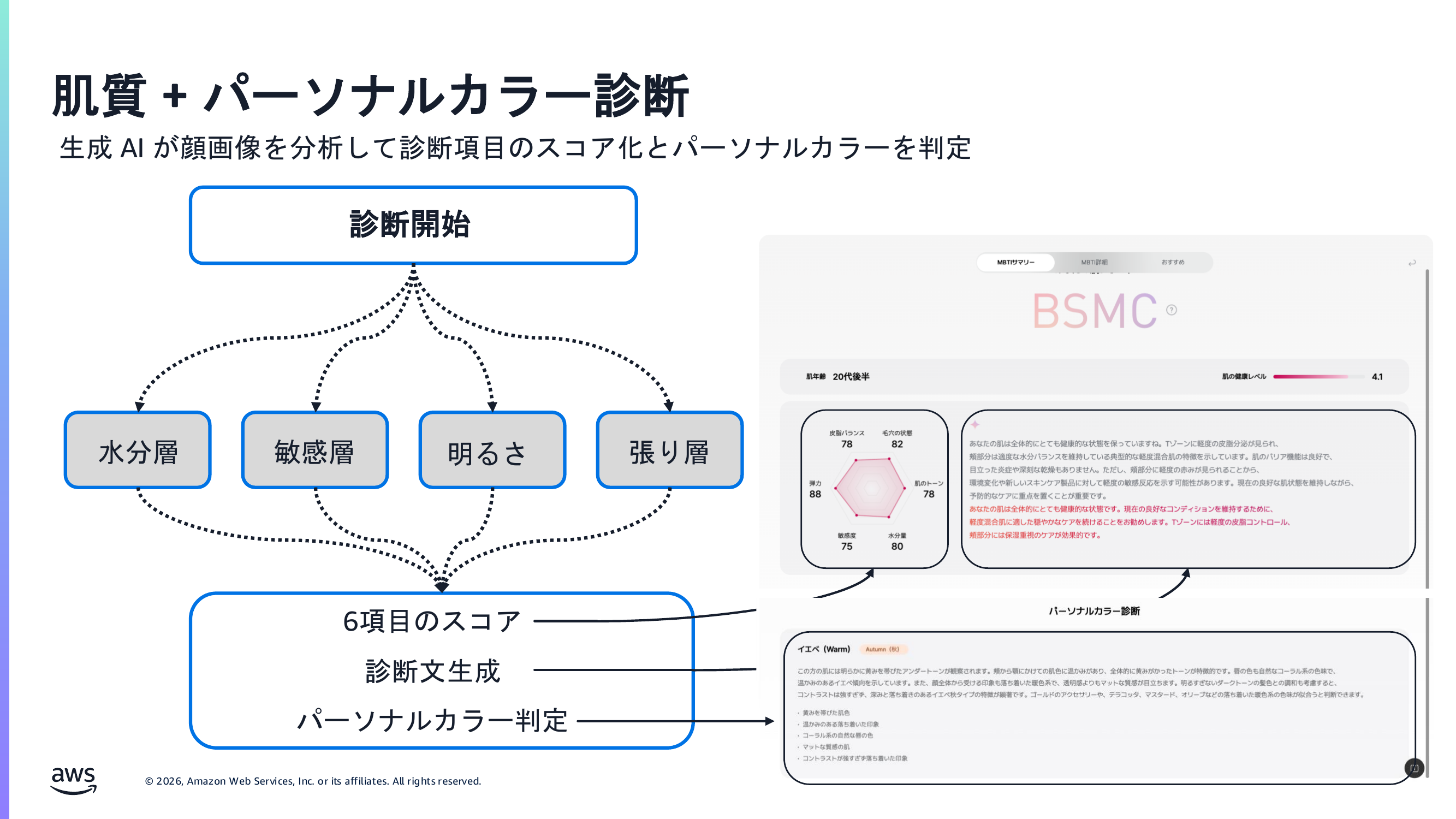 - Smart Beauty:画像解析により肌質を16タイプに詳細分類し、改善提案を自動化するデモです。美容部員の知見を AI が再現しています。(Smart Beauty 詳細資料)