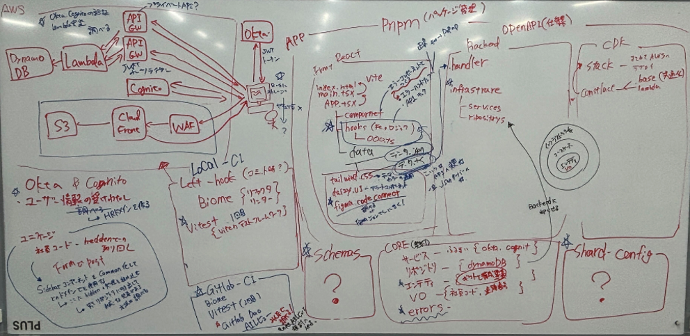 サンエー丸山氏: こちらを見てみてください。これは高原さんと宮良さんが パートナー企業と議論して書いたホワイトボードです。Discovery ワークやプロトタイピング後に 2 人が追加で学んだ部分もありますが、それでも EC2 と EFS の現行のアーキテクチャの説明もおぼつかなかった 2 人が、このようにホワイトボードにアーキテクチャを描き、パートナー企業と議論する姿を見ると、ご提案いただいた活動の効果を感じています。現在開発中の認証認可基盤が完成した後、アプリケーション側のモダナイズを実施する予定です。高原さんと宮良さんにはぜひこのプロジェクトを引っ張っていってもらいたいです。