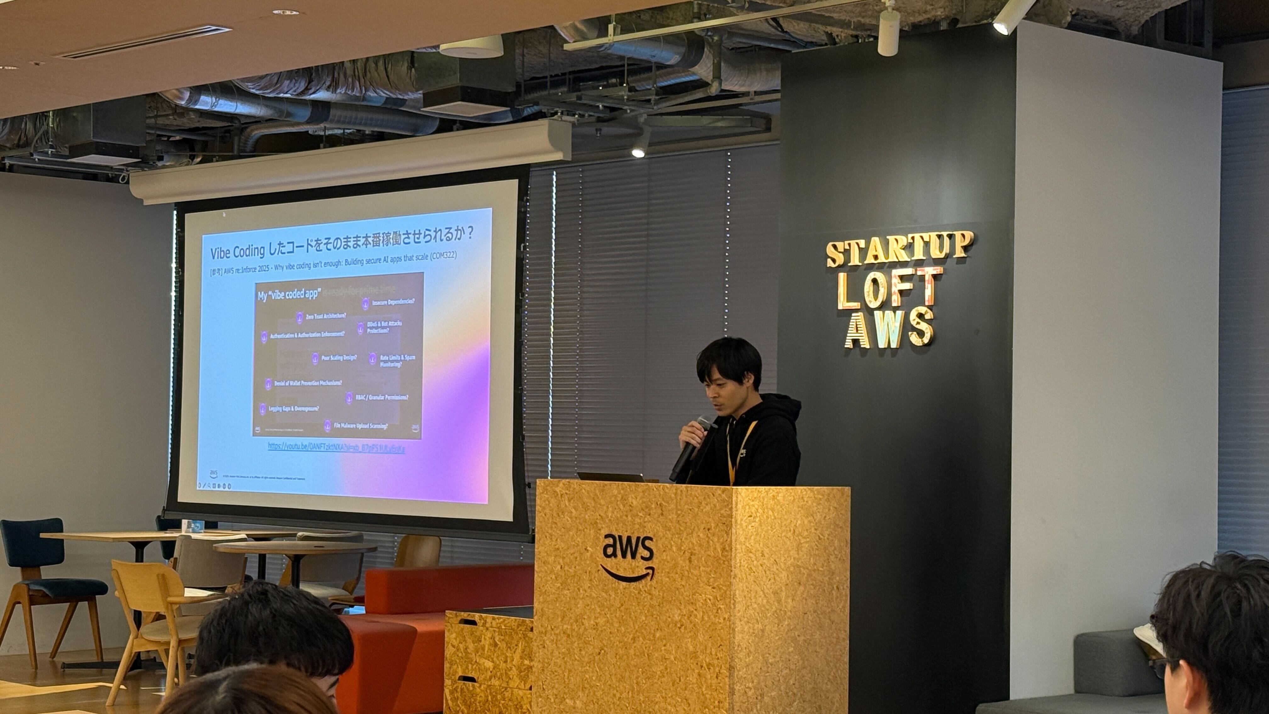 2025 年 11 月 21 日に「Security for App Builders @ Loft #1」イベントを目黒の AWS Startup Loft Tokyo にて開催しました。こちらは AWS 上のアプリケーションそのものや、SDLC (ソフトウェア開発ライフサイクル) におけるセキュリティの考え方にフォーカスした、開発者・セキュリティエンジニアの方向けのイベントです。第一回では特に Coding Agent が生成したコードの安全性の確保という課題に焦点を当てて開催しております。ご参加いただきました皆様には、改めて御礼申し上げます。