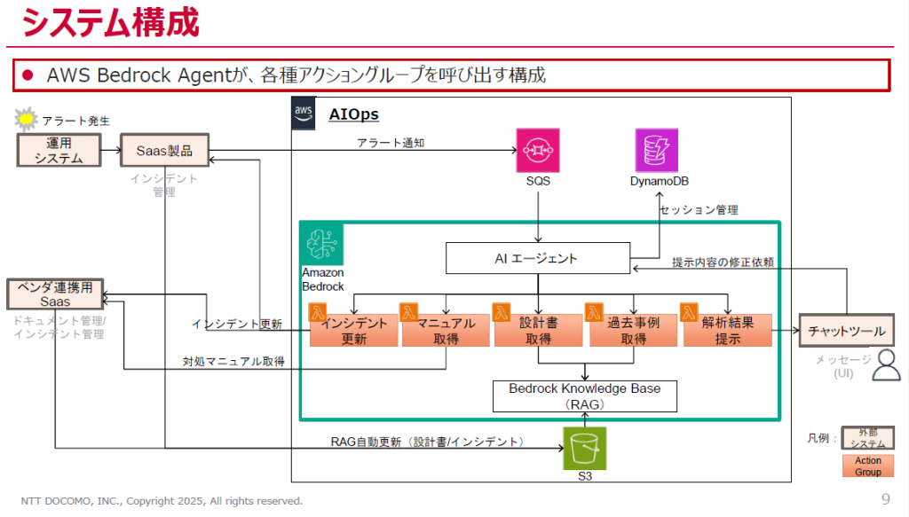 登壇時点では、AI エージェントによる監視措置業務の自律的な実行を実現し、アラート受信、分析、措置手順の提案までの自動化を達成され、そのソリューションとして Amazon Bedrock エージェントを使用していることをご説明いただきました (以下、システム構成図)。Bedrock エージェントの選定の理由としては、マネージドかつサーバーレスなためインフラの構築に時間をかけず迅速な開発を行うことができた点や、社内のセキュリティ承認を得るためのデータプライバシーの観点で Bedrock ではデータをモデルの学習にはしない点が評価されました。