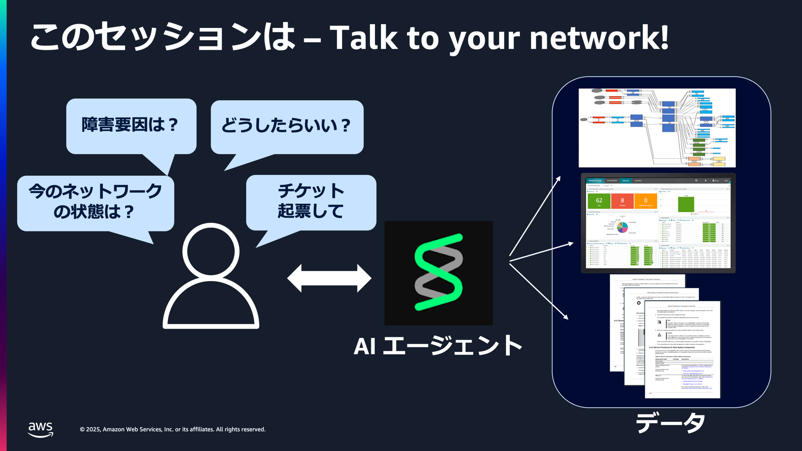 通信業界のオペレーション標準化団体である TM Forum では、Autonomous Network (自律ネットワーク)の自律レベルを定義しており、 近年、多くの通信事業者が L4 (高度自律ネットワーク) / L5 (完全自律ネットワーク) を目指す動きが出てきています。それを実現するためのコンポーネントの例と AWS で実現する参考アーキテクチャをご紹介しました。このアーキテクチャのキーは、AI エージェント × データであり、Autonomous Network の実現には必須要素であることをお伝えしました。そして、AI エージェントが自律的な行動を行うことができるようになった基礎技術や変遷と共に、オペレーション業務に携わるオペレータと近い動きができることを説明しました。最後に、AI エージェントの活用事例とネットワーク運用における AI エージェントの参考ユースケースをご紹介することで、最新の業界動向と AI エージェントによる自律運用が実現可能な世界であることをインフルエンスさせていただきました。