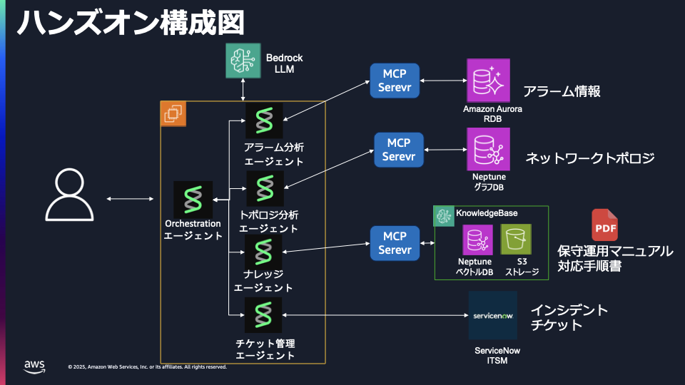 本ハンズオンでは、AWS の複数のサービスを統合した実践的な環境を構築しました。データストア層として、Amazon Neptune をグラフ DB とベクトル DB の両方で活用し、ネットワークトポロジデータとエージェント用の知識ベースを格納しました。また、Amazon Aurora (RDB) にはネットワークトポロジとアラーム情報を、Amazon S3 ストレージには保守運用マニュアルや対応手順書を格納しました。