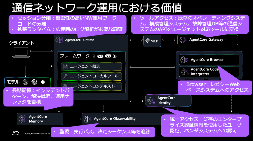 通信ネットワーク運用というワークロードに当てはめた際の使い方や価値についてもお伝えしました。例えば、機密性の高いNW運用ワークロードでは、Runtime のセッション分離のセキュアな環境が役立つでしょう。AI Agent とのやり取りの中で発見されたインシデントパターン、解決戦略などのナレッジを Memory に蓄積・活用していくことで、より精度を高められる可能性があります。