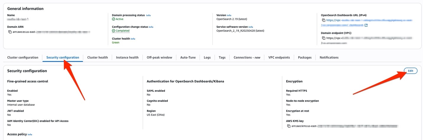 - 既存のプロビジョニングドメインにこの機能を追加するには、OpenSearch Service コンソールに移動し、セキュリティ設定タブに移動して編集を選択します。