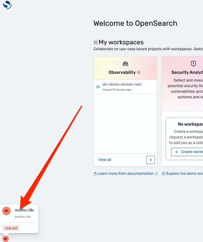 - IAM Identity Center でのログインプロセスを完了すると、OpenSearch UI が開きます。画面左下のユーザーアイコンを選択して、Identity Center からの正しいプリンシパルであることを確認します。先ほど選択した Identity Center プロパティと一致するはずです。
