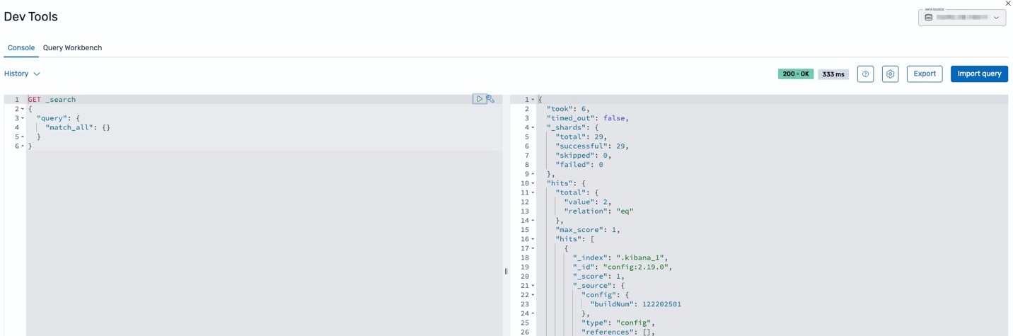 アイコンを選択します。 - 画面右上で正しい OpenSearch ドメインまたは OpenSearch Serverless コレクションのデータソースを選択し、