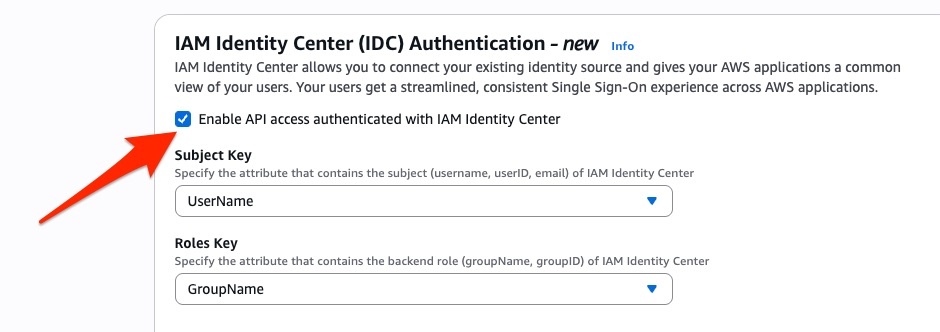 OpenSearch Service で IAM Identity Center の使用を開始する前に、いくつかのオプションを有効にする必要があります。まず、このガイドの手順に従って、IAM Identity Center の組織インスタンスまたはアカウントインスタンスをセットアップします。OpenSearch Service プロビジョニングドメインの場合、IAM Identity Center (IDC) 認証 – 新機能 オプションを有効にする必要があります。これは AWS CloudFormation、OpenSearch REST API、AWS SDK、または AWS マネジメントコンソールを通じて行えます。