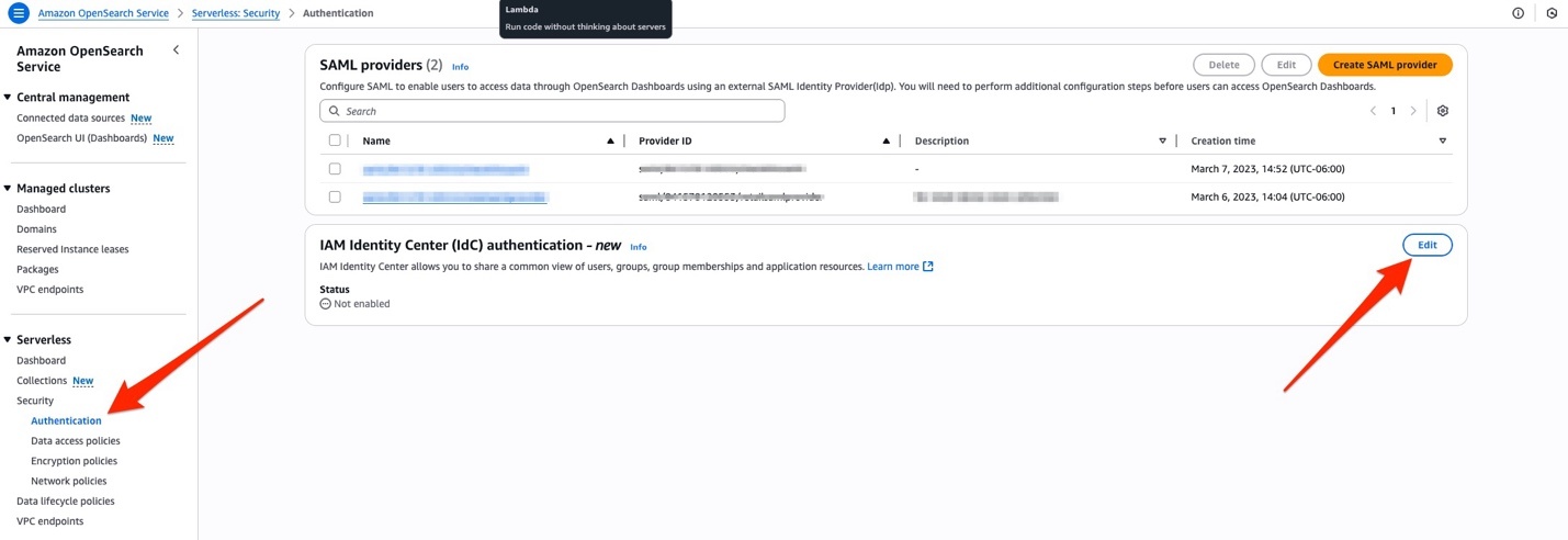 - OpenSearch Serverless の場合、ナビゲーションペインでサーバーレスを選択し、次にセキュリティと認証を選択します。IAM Identity Center (IdC) 認証 – 新機能 セクションで編集を選択します。