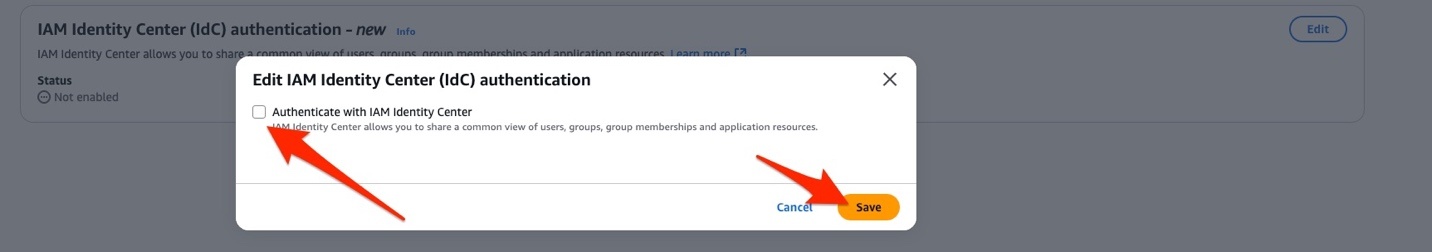 - IAM Identity Center で認証のチェックボックスを選択し、保存を選択します。