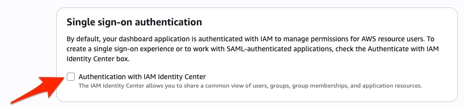 - OpenSearch UI アプリケーションを作成する際、シングルサインオン認証の下にある IAM Identity Center で認証のチェックボックスを選択します。OpenSearch UI アプリケーションの作成手順については、OpenSearch UI アプリケーションの作成を参照してください。