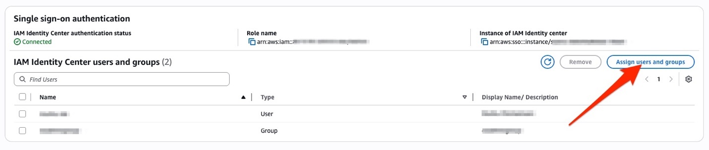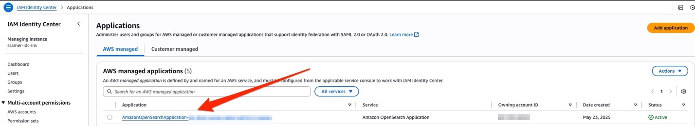 アプリケーションが作成され、ステータスがアクティブと表示されたら、アプリケーションにユーザーとグループを割り当てる必要があります。この割り当ては重要であり推奨されます。これらの割り当てによって、OpenSearch Service 内のデータアクセスのスコープと権限が決定されるためです。これを行うには、OpenSearch Service コンソールで前のステップで作成したアプリケーションを選択します。ここで、シングルサインオン認証の下に IAM Identity Center ユーザーとグループのオプションが表示されます。ユーザーとグループを割り当てを選択し、適切な Identity Center ユーザーとグループを選択します。