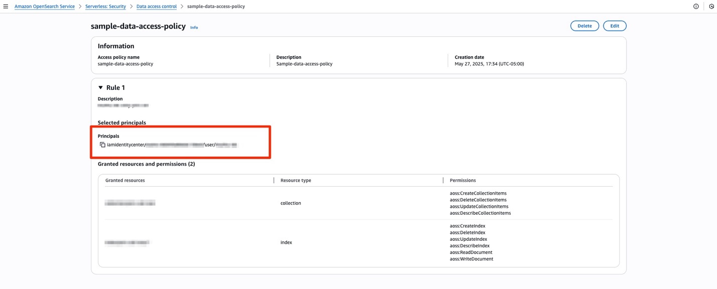 OpenSearch Serverless の場合、IAM Identity Center プリンシパルにコレクションへのアクセスに適切な権限を付与するために、新しいデータアクセスポリシーを作成するか、既存のポリシーにルールを追加する必要があります。例えば、次の図は、Rule 1 で特定のユーザーに特定の権限を付与し、Rule 2 でグループにより制限された権限を提供するデータアクセスポリシーを示しています。