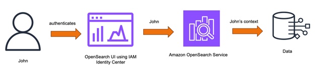 IAM Identity Center の信頼されたアイデンティティ伝播は、OpenSearch Service にアクセスする際にユーザーのアイデンティティコンテキストをロールに追加し、OpenSearch Service はこのコンテキストを使用して OpenSearch データアクセスを認可およびスコープ設定します。これにより、アプリケーションがユーザーに代わってデータにアクセスするため、お客様の認証・認可フローが簡素化されます。ユーザーまたはユーザーエージェントは、この認可が行われるためにアプリケーションとバックエンドサービスの間に存在する必要がありません。これは、アサーションを交換するための仲介としてユーザーエージェントがこれらのエンティティ間に存在する必要がある SAML のような方法とは異なります。この柔軟性により、OpenSearch Service ドメインの Amazon Virtual Private Cloud (Amazon VPC) 内にあるデータや OpenSearch Serverless コレクションなど、さまざまなデータソースへのアクセスが簡素化されます。OpenSearch UI を使用することで、バックエンド接続をさらに簡素化し、データへのシームレスなアクセスを実現できます。次の図は、OpenSearch Service でアイデンティティ伝播がどのように機能するかを示しています。