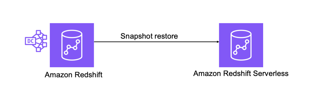 Amazon Redshift Serverless にアップグレードするには、次の図に示すように、スナップショット復元を使用して Amazon Redshift から Amazon Redshift Serverless に直接移行できます。スナップショット復元では、ユーザーとその関連する権限、設定、スキーマ構造に加えて、データとオブジェクトが復元されます。移行にスナップショット復元を使用することで、本番環境の Amazon Redshift DC2 クラスターに影響を与えることなく、ターゲットの Amazon Redshift Serverless ウェアハウスを検証できます。また、スナップショット復元を使用して、Amazon Redshift DC2 ワークロードを異なるリージョンやアベイラビリティーゾーンに移行することもできます。