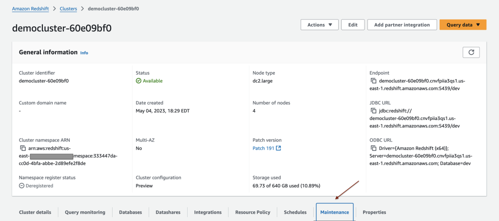 - Redshift コンソールで、ナビゲーションペインの [クラスター] を選択します。クラスターを選択し、[メンテナンス] を選択します。